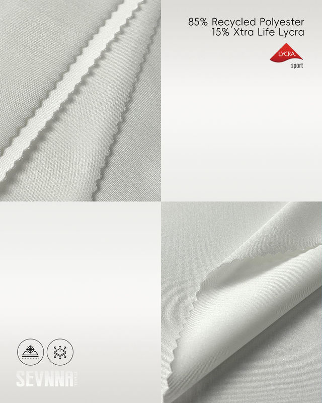 ด้วยส่วนประกอบของพอลิเอสเตอร์รีไซเคิล 85% และ 15% Xtra Life Lycra ผ้า Lycra สายยืดนี้ไม่เพียงแต่เป็นมิตรต่อสิ่งแวดล้อม แต่ยังคงทนได้นานผ้า นี้ เป็น ที่ รู้ จัก เพราะ สามารถ รักษา รูปร่าง และ สี ของ มัน ได้ แม้ ว่า จะ ถูก ล้าง หลาย ครั้ง, ทําให้มันเป็นทางเลือกที่น่าเชื่อถือสําหรับนักออกแบบ เสื้อออกกําลังกาย